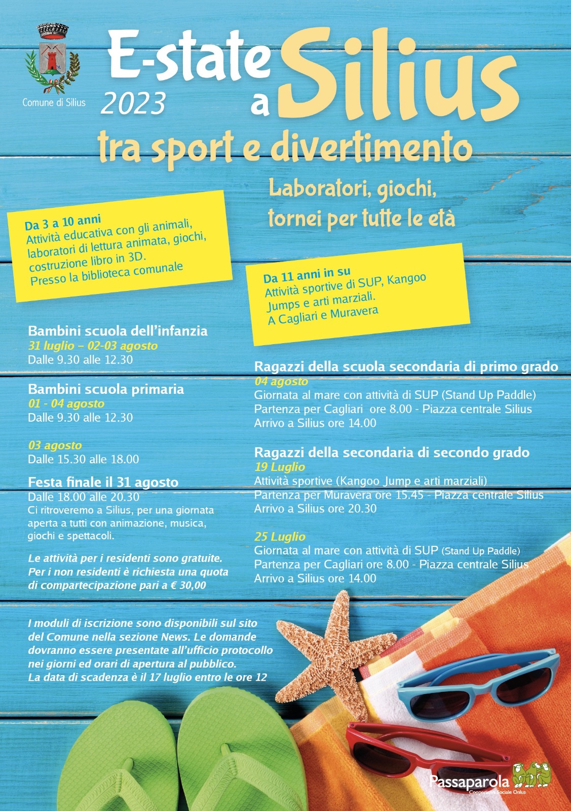 SI INFORMANO LE FAMIGLIE CHE SONO APERTE LE ISCRIZIONI AL PROGRAMMA COMUNALE “E – STATE A SILIUS 2023” – ATTIVITA’ DI INTEGRAZIONE E POTENZIAMENTO DEL PROGETTO INTERCOMUNALE "ESTATE GERREI 2023" RIVOLTE AI MINORI DELLA SCUOLA DELL’INFANZIA, PRIMARIA, SECONDARIA DI I GRADO E AI MINORI FINO AL 17° ANNO COMPIUTO.