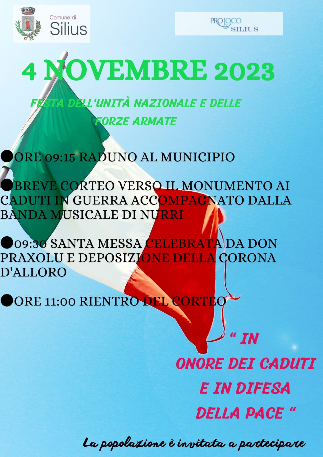 L'Amministrazione Comunale, in collaborazione con l'Associazione Turistica Proloco Silius, invita tutta la popolazione a partecipare alla celebrazione della solennità civile del 4 novembre, per commemorare tutti i valorosi combattenti caduti in guerra e per la Patria.