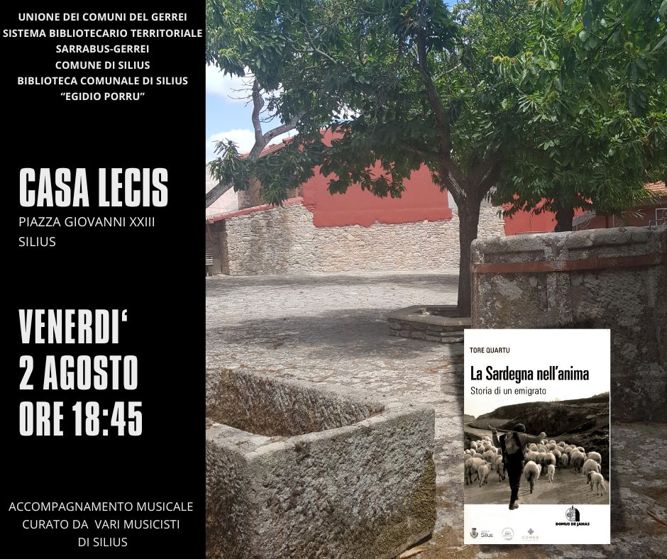 IL COMUNE DI SILIUS, LA BIBLIOTECA COMUNALE "EGIDIO PORRU" CON IL SISTEMA BIBLIOTECARIO DELL'UNIONE DEI COMUNI DEL SARRABUS GERREI SONO LIETI DI INVITARVI ALLA PRESENTAZIONE DEL LIBRO "LA SARDEGNA NELL'ANIMA- Storia di un Emigrato". L'EVENTO SI TERRA' VENERDI' 2 AGOSTO 2024 DALLE ORE 18.45 PRESSO LA "CASA LECIS".